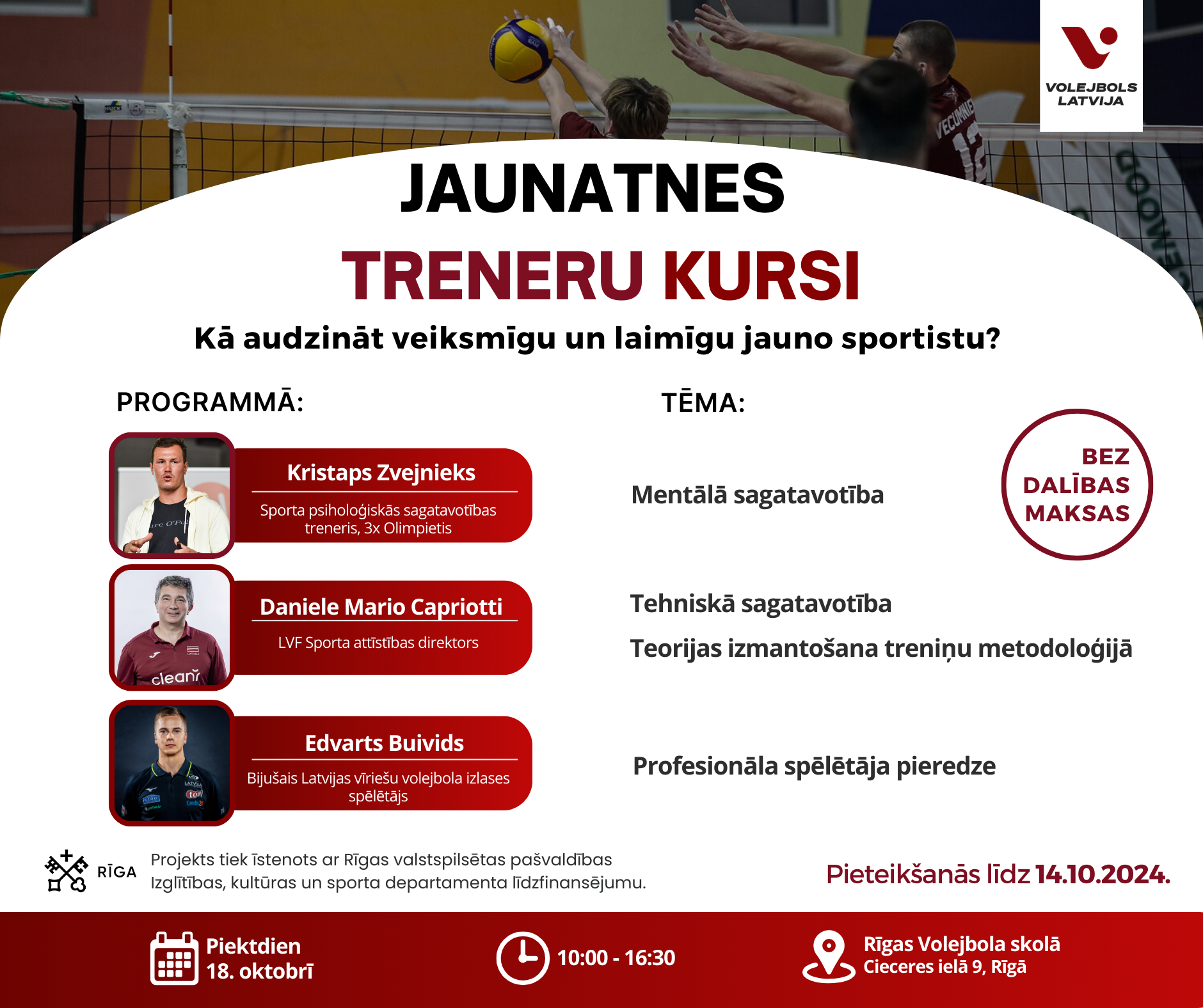 Kursus vadīs sporta psiholoģiskās sagatavotības treneris un trīskārtējais Olimpietis Kristaps Zvejnieks, Latvijas Volejbola federācijas Sporta attīstības direktors Daniele Mario Capriotti, un savā pieredzē dalīsies arī bijušais Latvijas Vīriešu volejbola izlases spēlētājs Edvarts Buivids!
